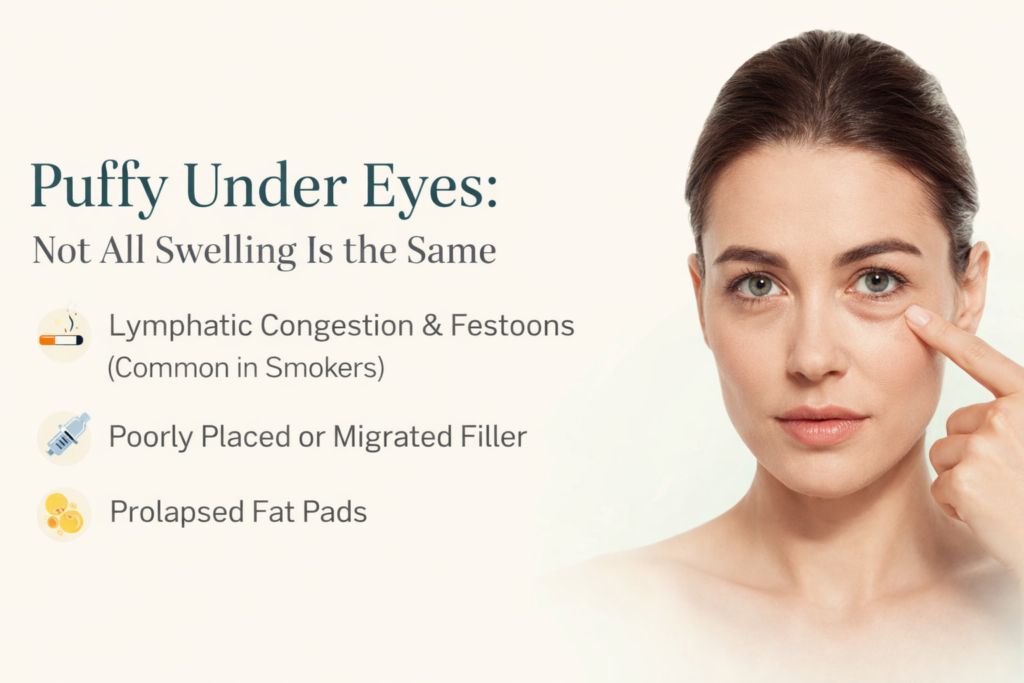 Persistent under-eye swelling is not always “normal aging” or allergies. In many cases, it is related to old filler interfering with lymphatic drainage, even years after injection.